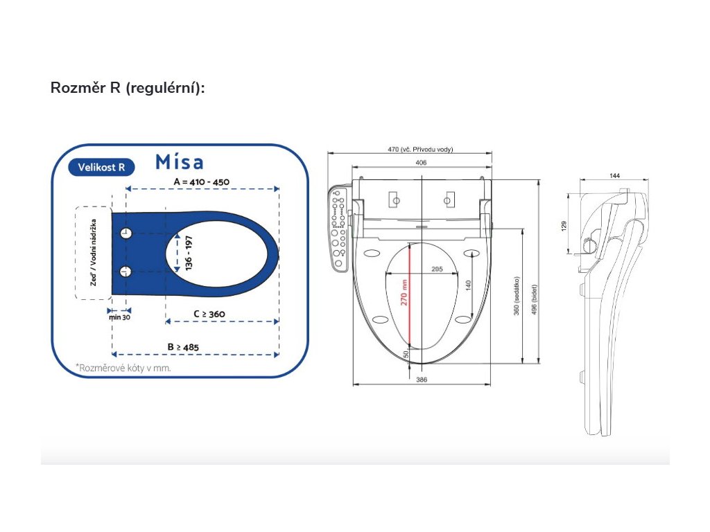 Elektronický bidet s postranním panelem. Dle velikosti toaletní mísy vyberte variantu produktu o velikosti R -standartní nebo S - zkrácená