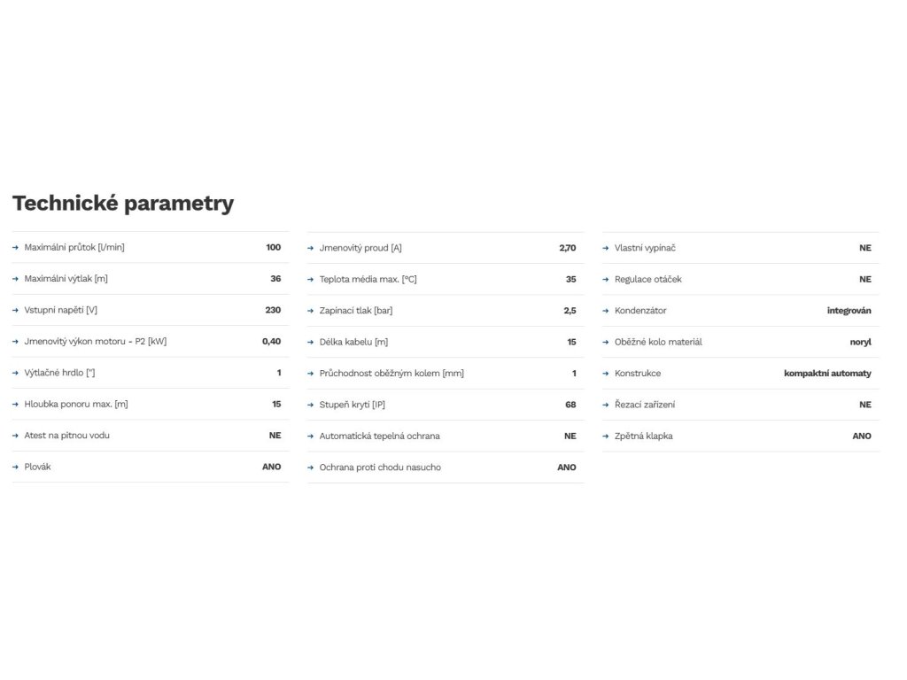 Ponorná čerpadla se zabudovanou elektronikou pro zcela automatický provoz. Zabudovaná tepelná ochrana i ochrana proti chodu nasucho a zpětná klapka. Vhodné pro automatické závlahy i jako hlavní zdroj vody pro domácnost. Pro vrty a studny od průměru 160mm. Kabel 15 metrů.