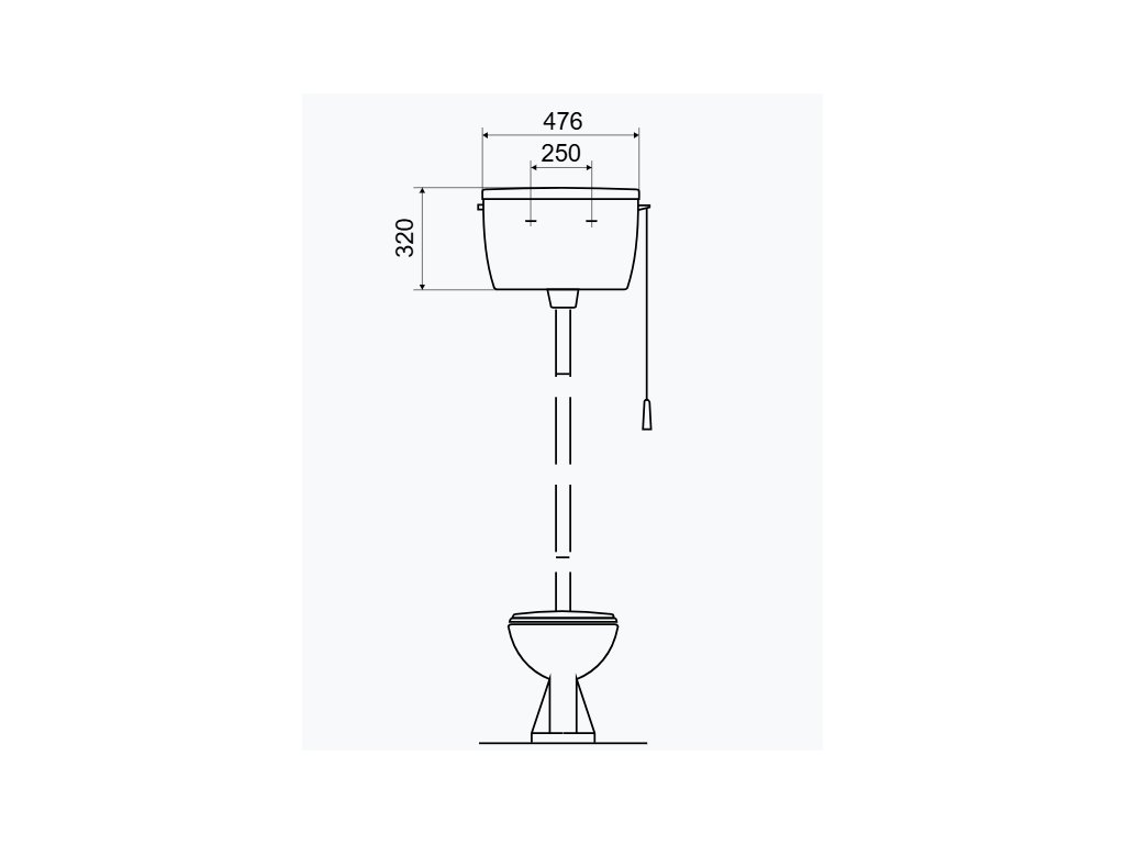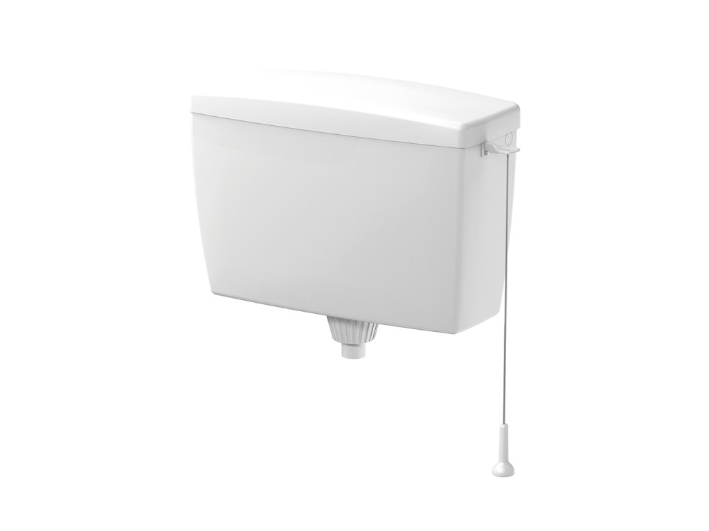 Vysokopoložená nádržka k samostatnému WC klozetu, splachování šňůrkou s táhlem, splachovací množství 3 a 9l, přívod vody zleva a zprava.